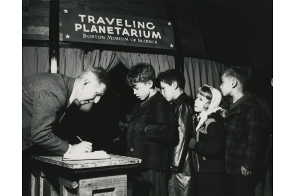 So in 1948, the first transportable planetarium was unveiled to provide projection shows in schools, libraries and churches in New England. The 18-foot (about 5 ½ meters) diameter wooden structure housed a Spitz star projector and seated 50 people. The planetarium was used by the MOS and later by a local school until 2006.